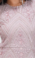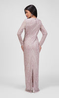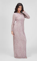 Eksklusiv lavendelfarvet gallakjole med lange ærmer og håndsyet art-deco inspireret perlebroderi.
