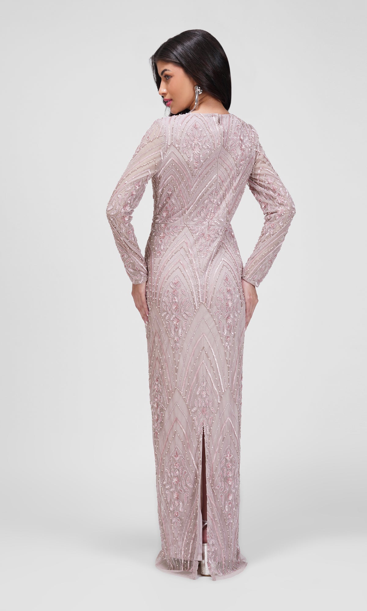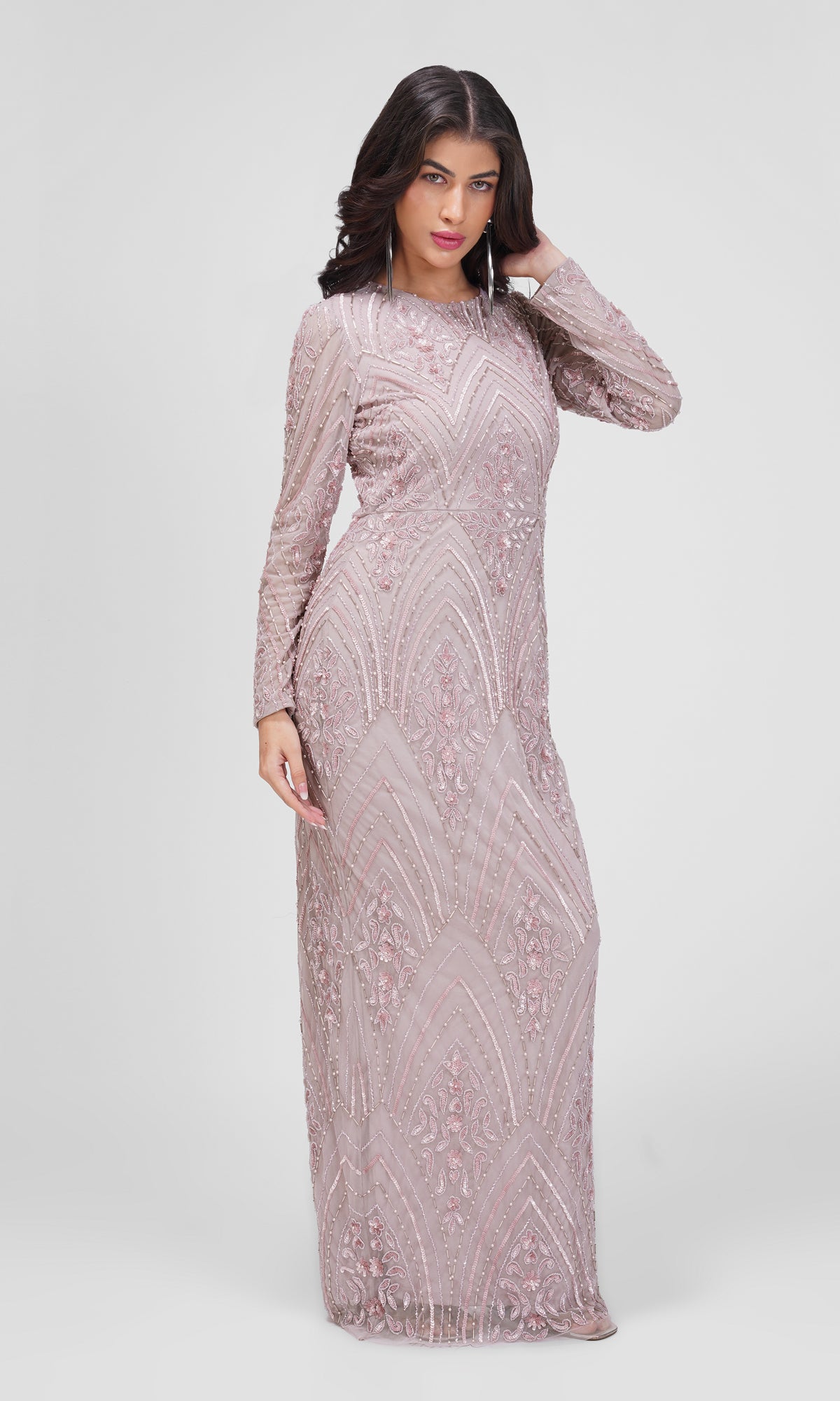 De lange ærmer og den slanke silhuet fremhæver figuren på en elegant og diskret måde, mens de håndsyede perler og palietter skaber et smukt skær i lyset.