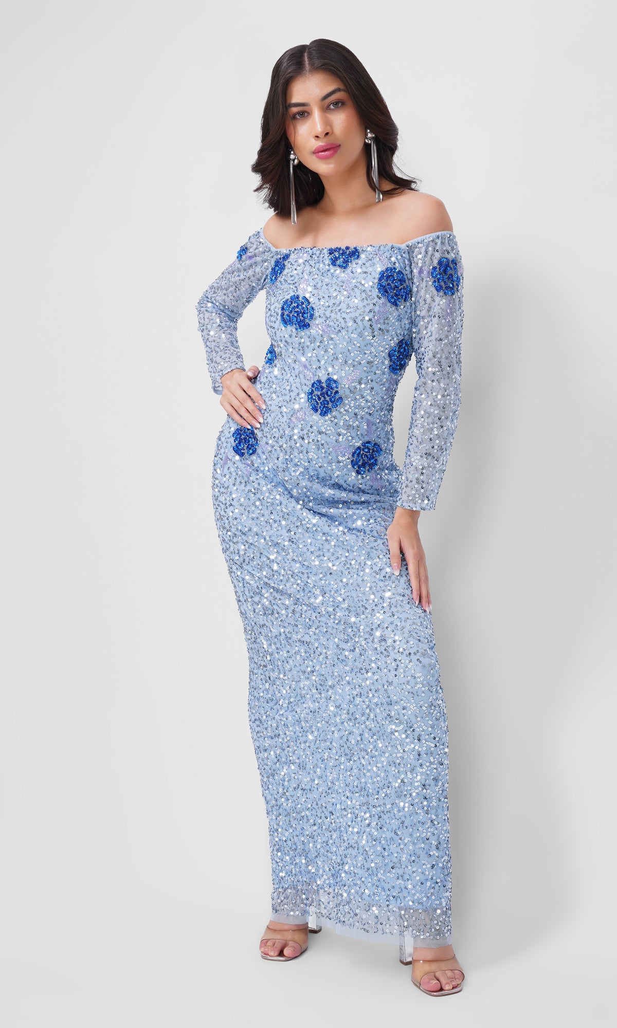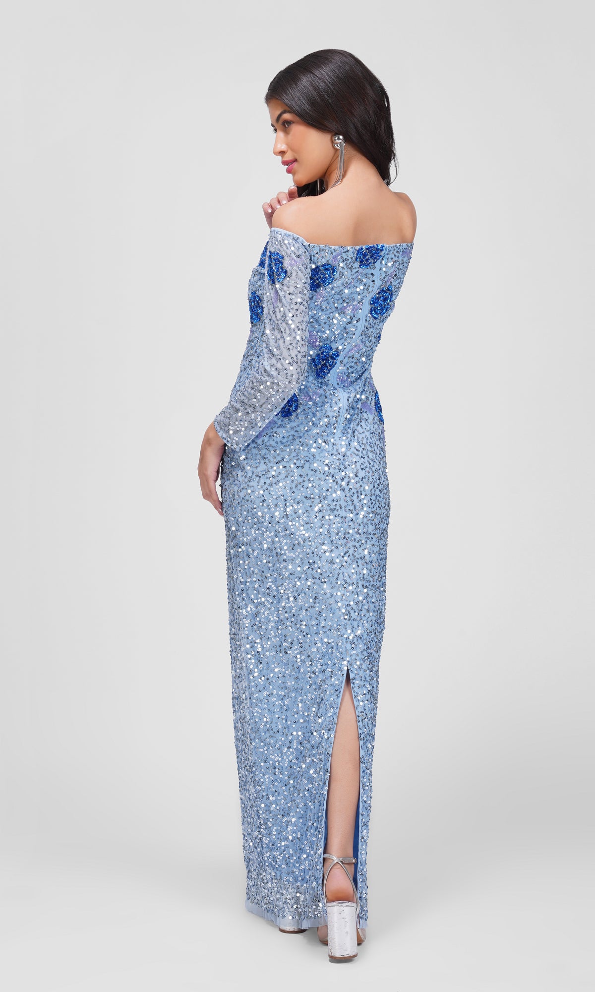 Elegant isblå gallakjole med off-shoulder snit, lange ærmer og håndsyede blå blomster i perler og palietter.