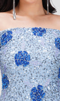 Kjolen er udsmykket med håndsyede perler, palietter og markante blå blomsterdetaljer, der skaber et unikt og eksklusivt mønster. Silhuetten er slank og flatterende, perfekt til bryllupper, store fester og formelle begivenheder, hvor man ønsker at skille sig ud med stil.