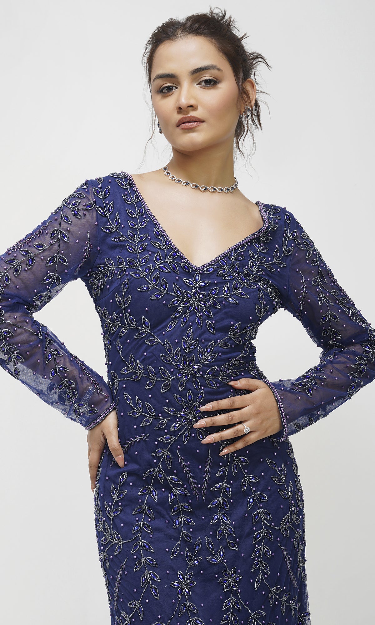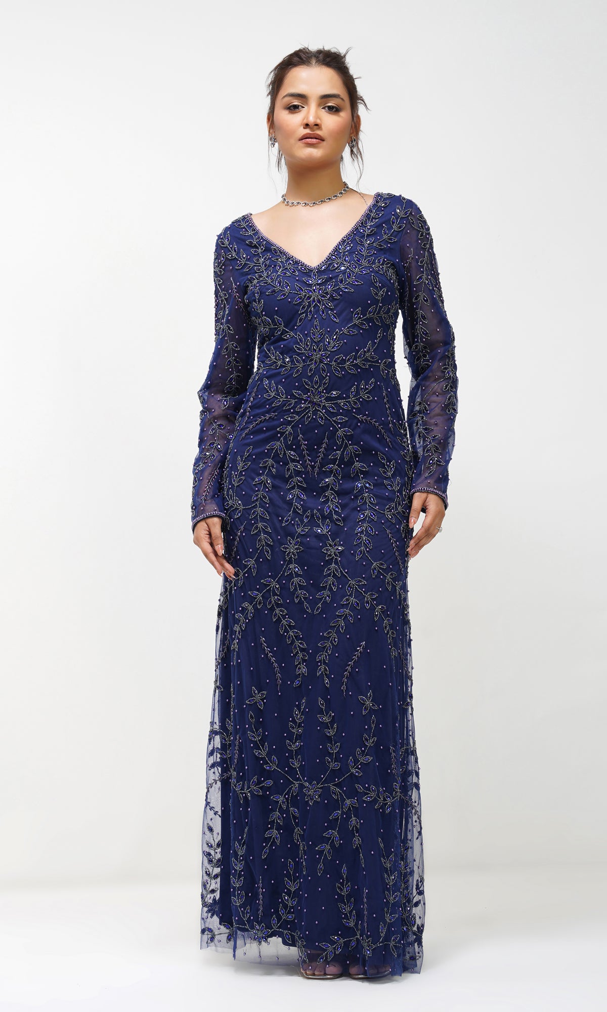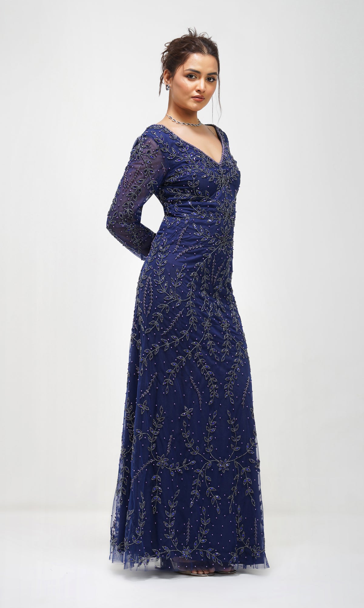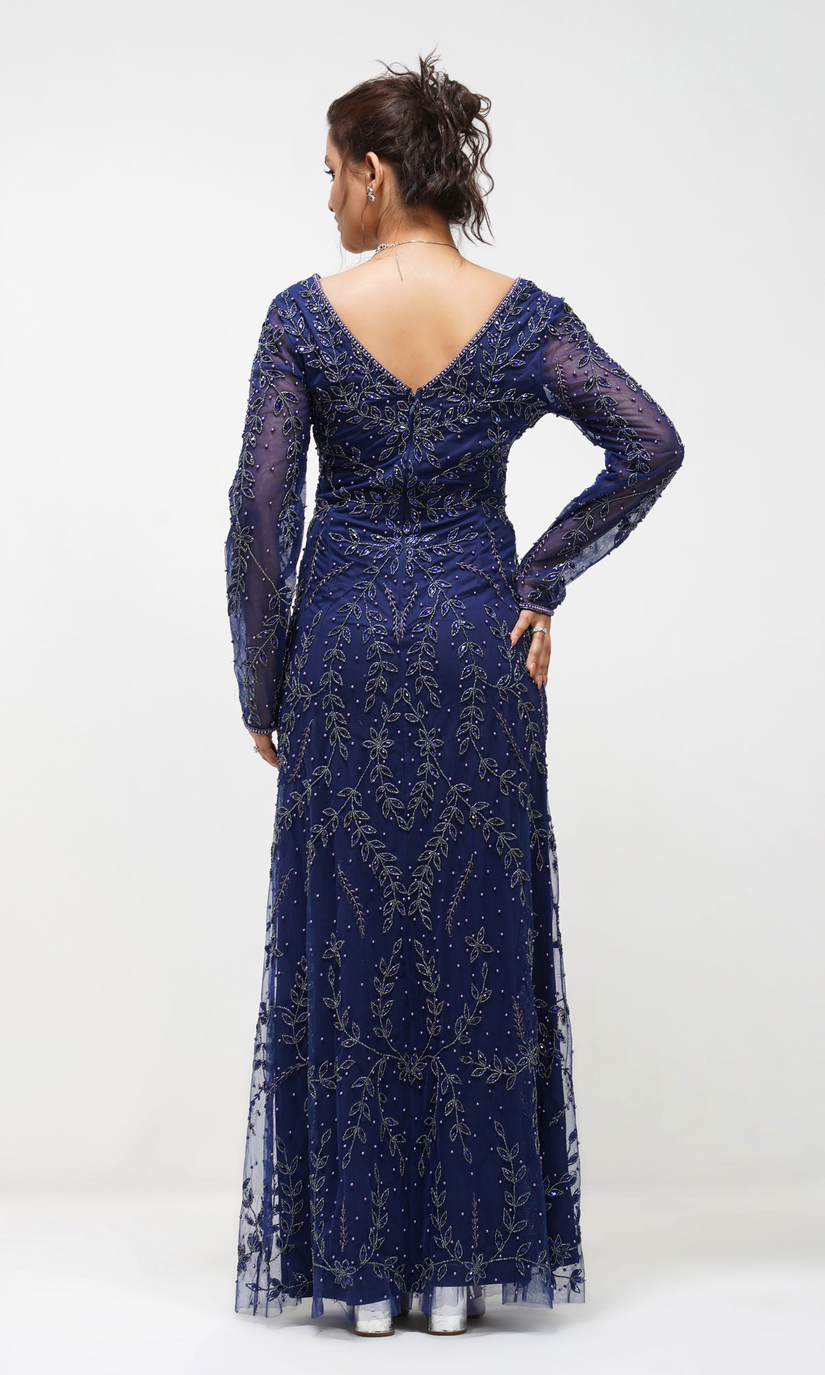 Denne eksklusive navy blå gallakjole er et sandt kunstværk, hvor naturens skønhed møder håndværk i verdensklasse. Kjolen er dækket af håndsyede perler og palietter, der danner et elegant mønster af blade og blomster, som glimter smukt ved hvert eneste skridt. Hver detalje er syet på i hånden, hvilket gør kjolen til et unikt stykke kunst, skabt med tålmodighed og præcision.