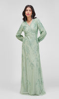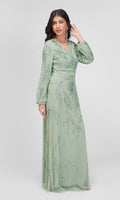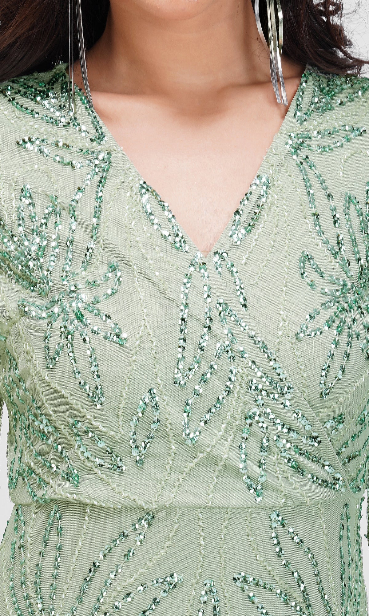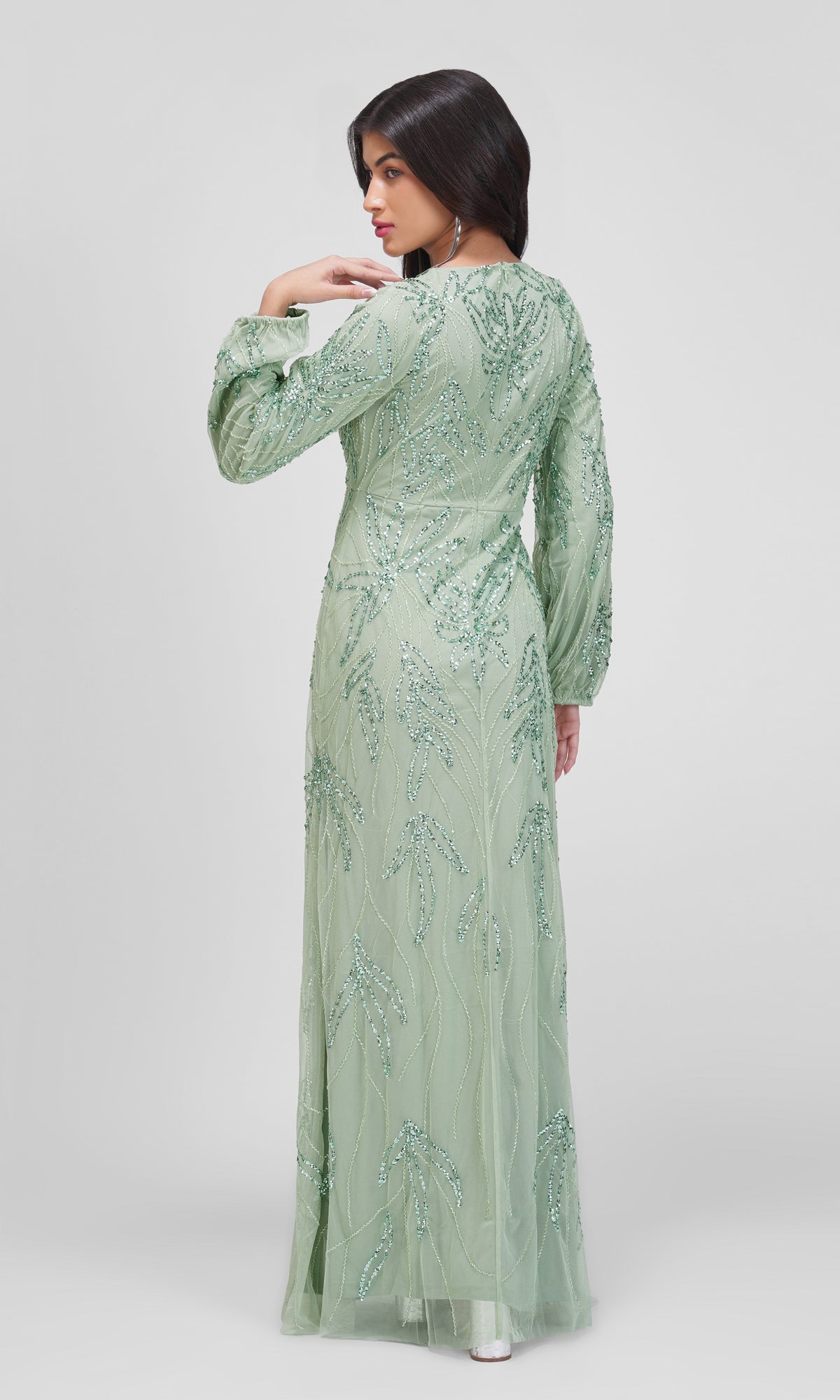 Kjolen er udsmykket med smukke pailletbroderier, der danner et elegant mønster og giver et luksuriøst og glitrende udtryk. Den har en flatterende V-udskæring og lange, let transparente ærmer med samme fine detaljer. Designet fremhæver figuren på en sofistikeret måde og udstråler friskhed og ynde. Perfekt til galla, bryllup eller andre festlige lejligheder, hvor du ønsker et feminint og eksklusivt look.
