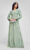 Elegant gulvlang aftenkjole i en blid mintgrøn farve.