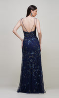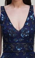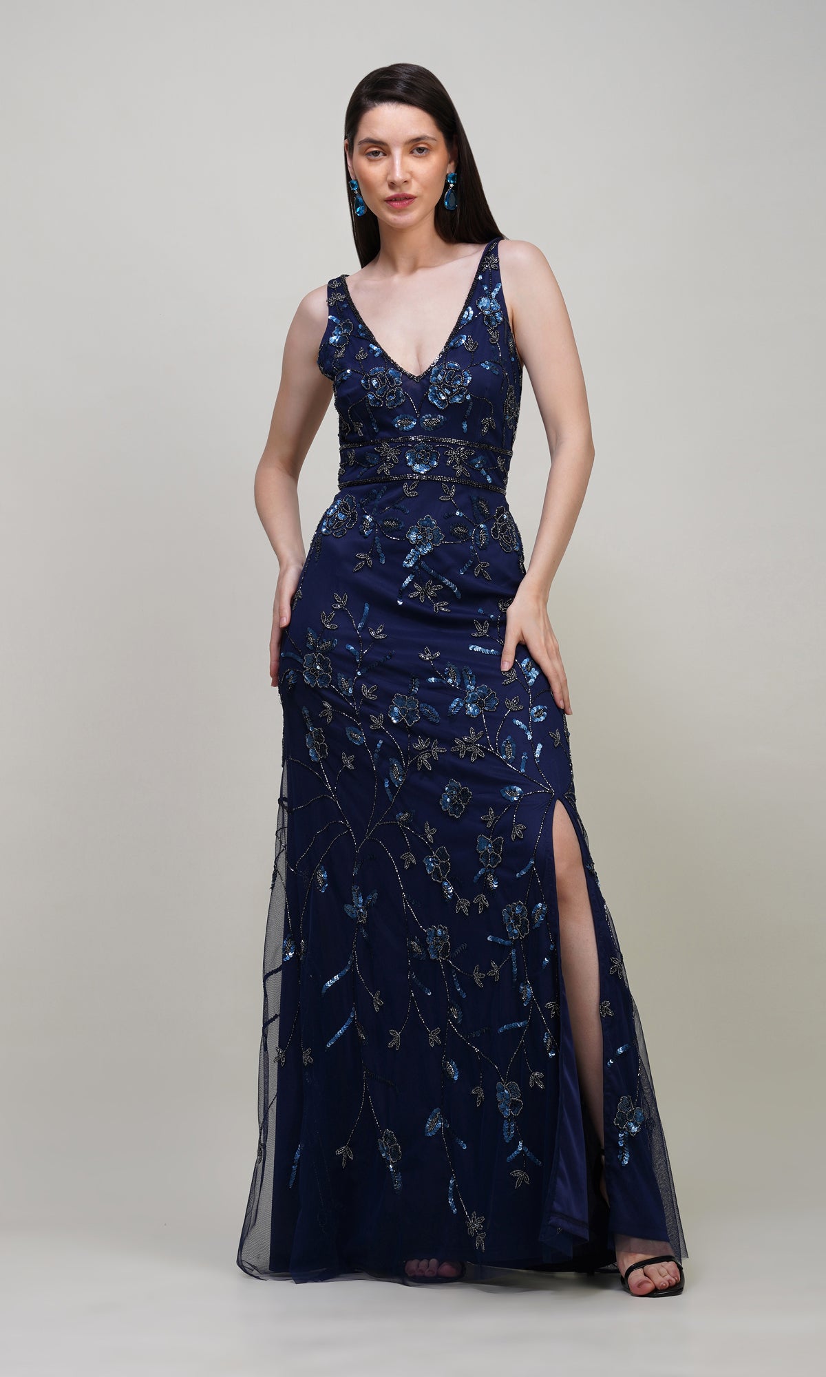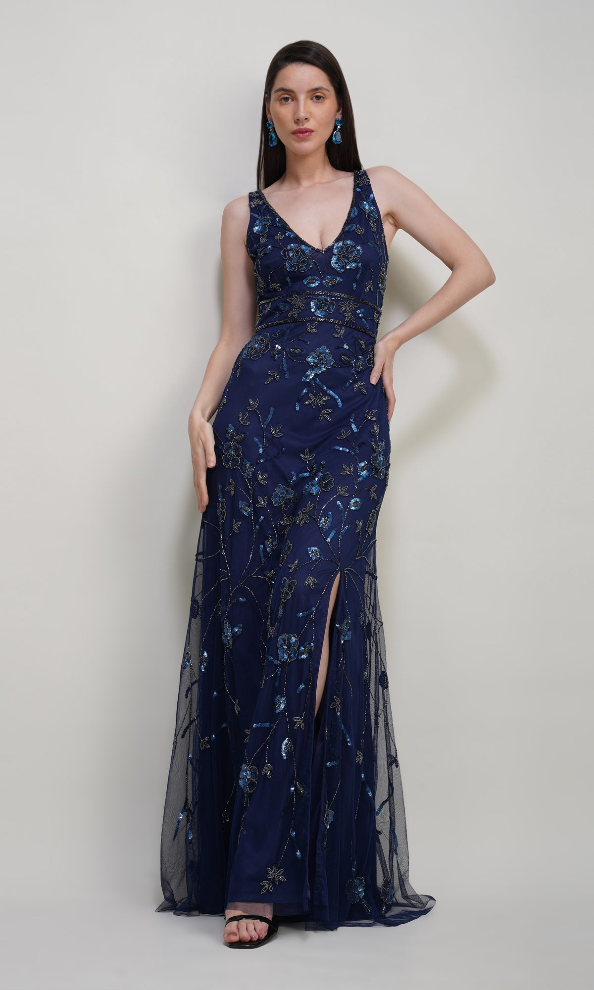 Denne mørkeblå gallakjole er en hyldest til både femininitet og elegance. Kjolen er dækket af smukke, håndsyede blomsterbroderier og palietter, der glimter i blå nuancer og skaber et eksklusivt, tredimensionelt udtryk. Hver detalje er syet på i hånden, hvilket gør kjolen til et unikt kunstværk.