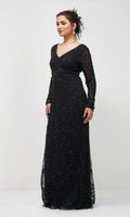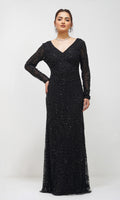 Det figursyede snit med den feminine V-udskæring giver en flatterende silhuet, mens de lange transparente ærmer tilføjer et sofistikeret udtryk. Med en længde på ca. 148 cm er kjolen perfekt til galla, bryllup, rød løber og andre særlige begivenheder, hvor du ønsker at udstråle luksus og styrke.