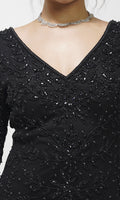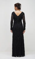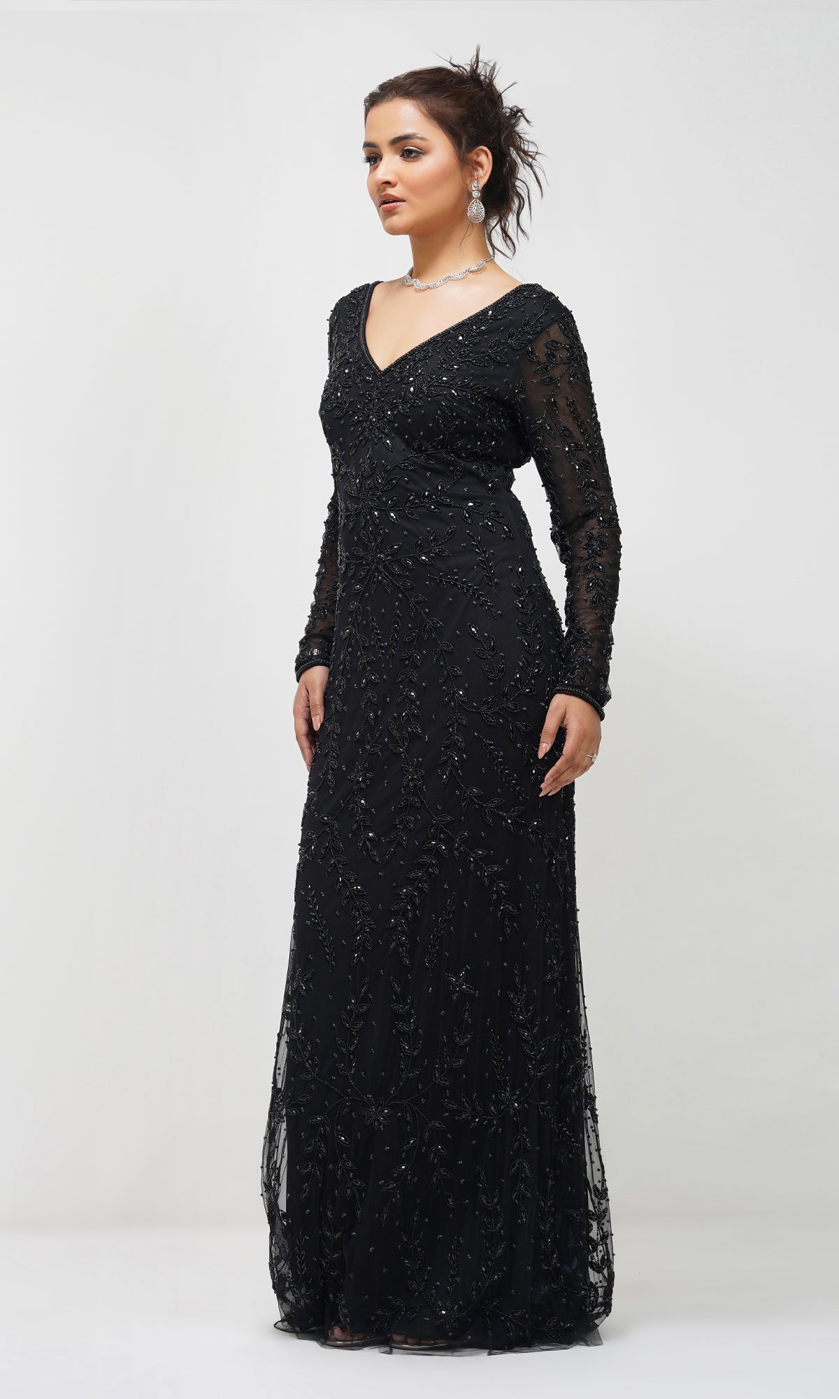 Denne sorte gallakjole er indbegrebet af dramatisk elegance. Kjolen er håndlavet og dekoreret med hundredevis af perler og palietter, der danner et blad- og blomsterinspireret mønster. Alle detaljer er syet i hånden med stor præcision, hvilket gør hver kjole til et unikt kunstværk.