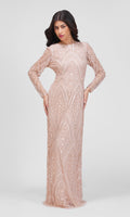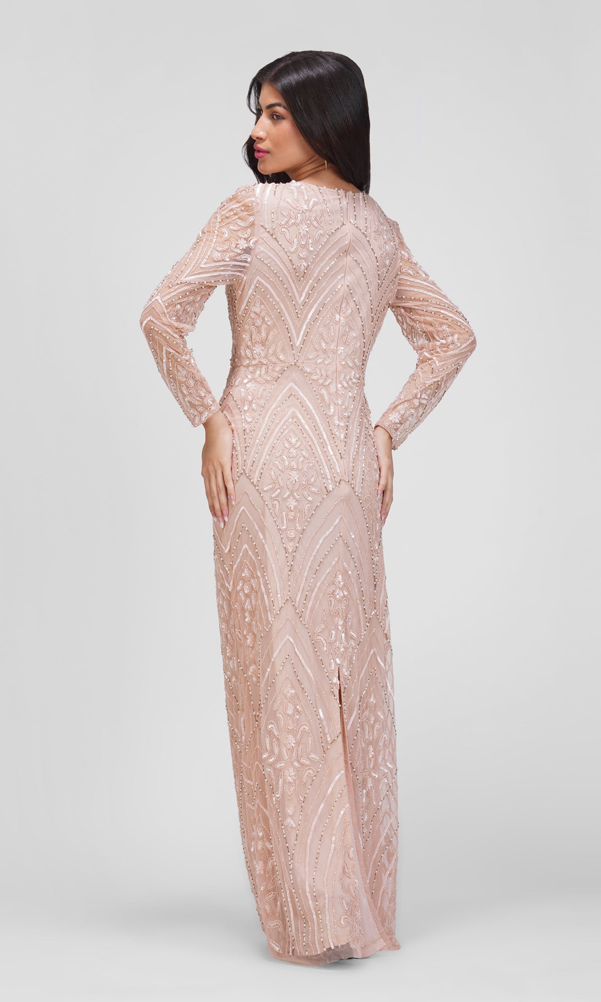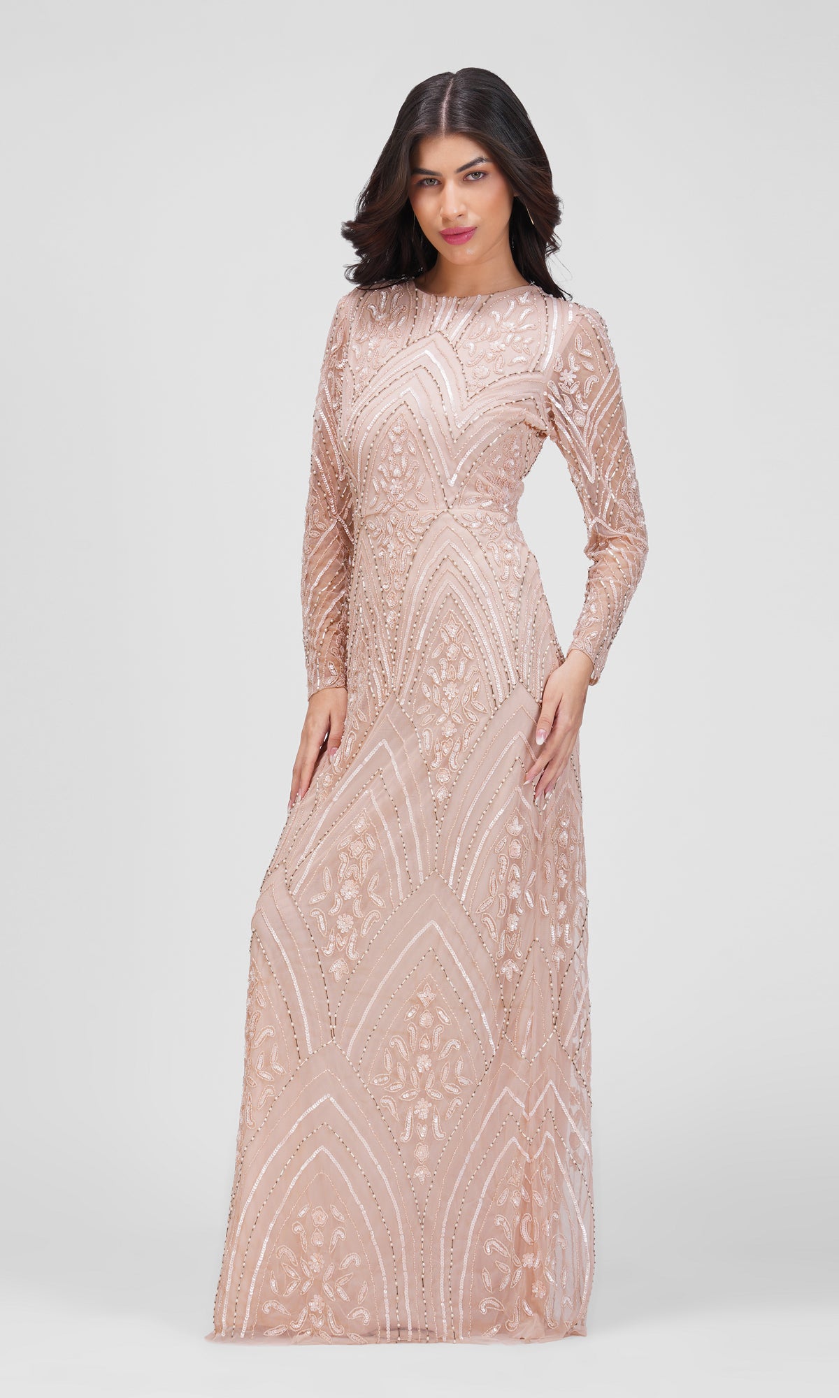 Det figursyede snit fremhæver kroppens naturlige former, mens de lange transparente ærmer giver et sofistikeret udtryk. Kjolen har en klassisk rund halsudskæring og en diskret slids bagpå, som tilføjer både komfort og et strejf af elegance. Perfekt til galla, bryllupper og andre særlige begivenheder, hvor du vil udstråle romantisk glamour.
