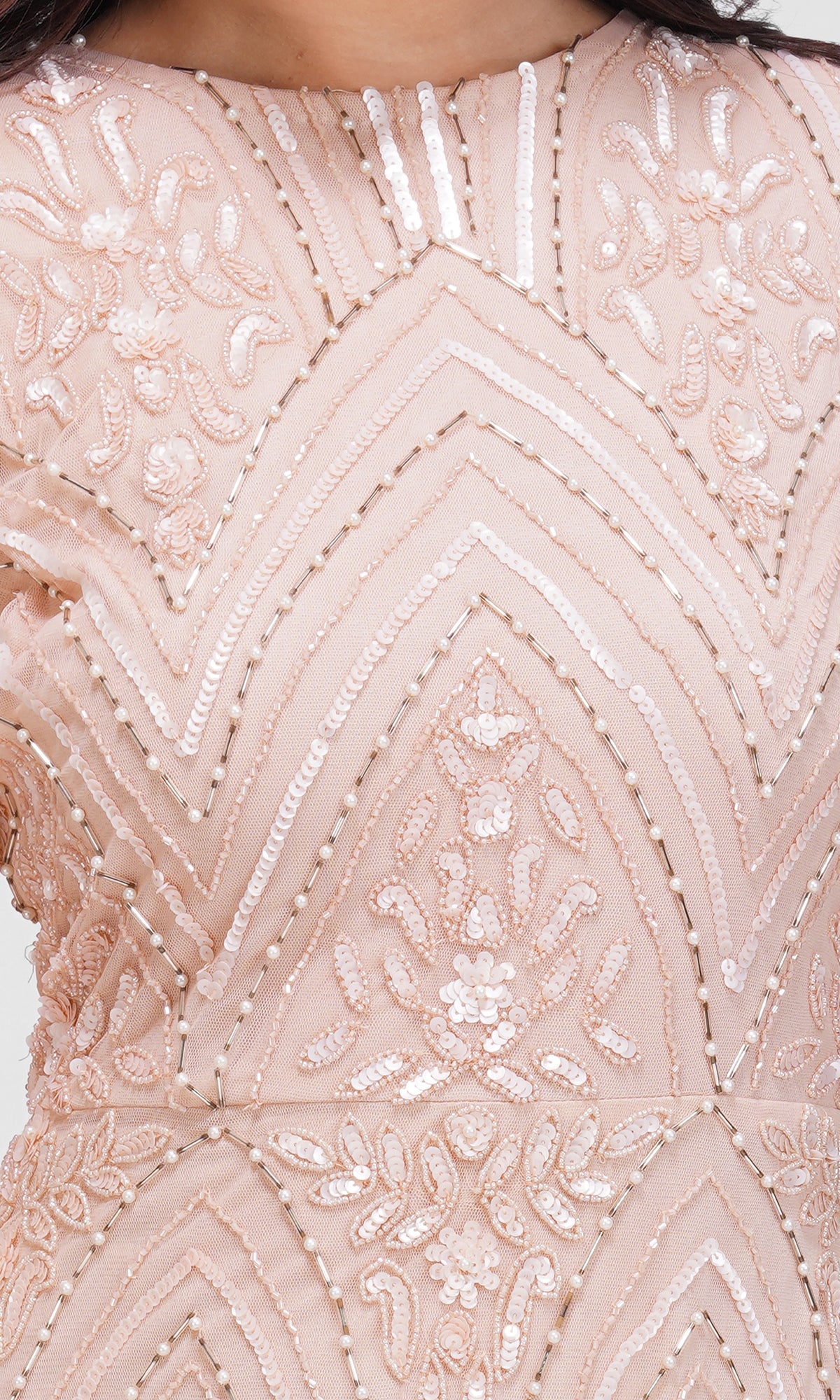 Denne elegante kjole udstråler luksus og femininitet. Den er dækket af håndsyede perler og palietter, der danner et smukt art-deco-inspireret mønster og fanger lyset ved enhver bevægelse. Hver detalje er syet i hånden med stor præcision, hvilket gør kjolen til et ægte håndlavet kunstværk.